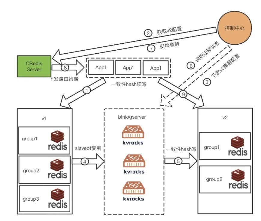 既然缩分片比较困难,我们首先想到的是业务双写集群的方法,也就是业务同时双写2个新老集群,新老集群的分片数是不一样的,并且大小配置也不一样。比如之前申请4个分片现在发现资源过剩,让业务创新申请一个新的2个分片的集群,由业务来控制灰度写哪个集群(图4)。最终会迁移到新集群上,而新集群大小是满足当前业务需求的,从而达到了缩容的目的。双写集群的方案虽然解决我们部分的问题,但对于业务的侵入比较深,此外由于双写集群引入了业务配合观察的时间,整体流程也比较长。所以,我们需要寻找更好的解决方案。既然业务双写集群可以达到要求,基础设施如果代替业务做完这部分岂不是更好?借鉴业务双写集群的思路和云原生的不可变基础设施的理念,我们首先想到的是通过新集群替换老集群而不是原地修改集群;另外,为了在公有云上节省Redis成本,我们积累了kvrocks的实践经验,两者相结合,设计了一种高效的水平扩缩容的方案。本方案的核心是引入了一个基于kvrocks改造的中间态binlogserver,它既是一个老集群的Slave节点,又充当了新集群的客户端。一方面,它会从Redis Master复制全量和增量数据;另一方面,它又充当客户端的角色,将复制来的数据按照新集群的一致性HASH规则写往新的集群。大致的步骤如下,具体的步骤流程可以参考下面的图所示(图5)。1)根据当前V1集群的分片启动对应个数binlogserver,并获取V2集群的一致性HASH规则和group。2)每个binlogserver成为V1集群单个分片中Master的Slave,执行salveof后保存V1中Master传过来的RDB文件并解析,对于每个RDB文件,解析还原成Redis命令,并按CRedis的一致性hash规则写入到V2中,对于后续V1集群传播过来的命令,同样同步到V2中。3)当这个过程都完成并且binlog追的差不多的时候,为了数据一致性,可以停止V1的写(客户端报错)后由CRedis推送V2的配置或直接推送V2的配置(客户端不报错但数据可能会丢或不一致),APP端将会顺序切换到 V2上来;此过程对用户完全透明,应用端无需做任何操作。