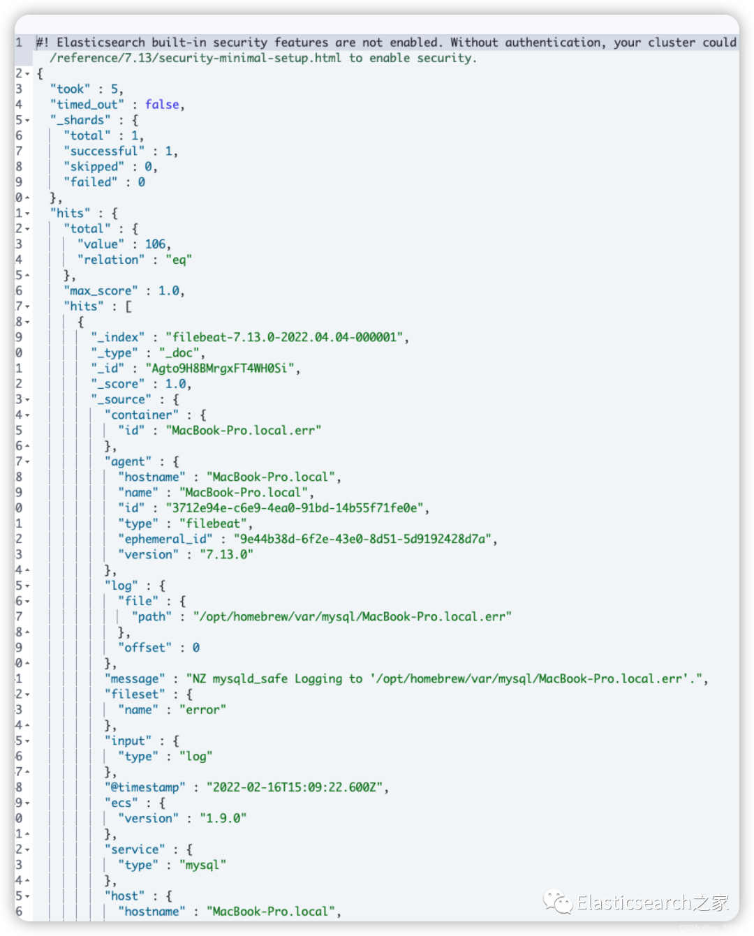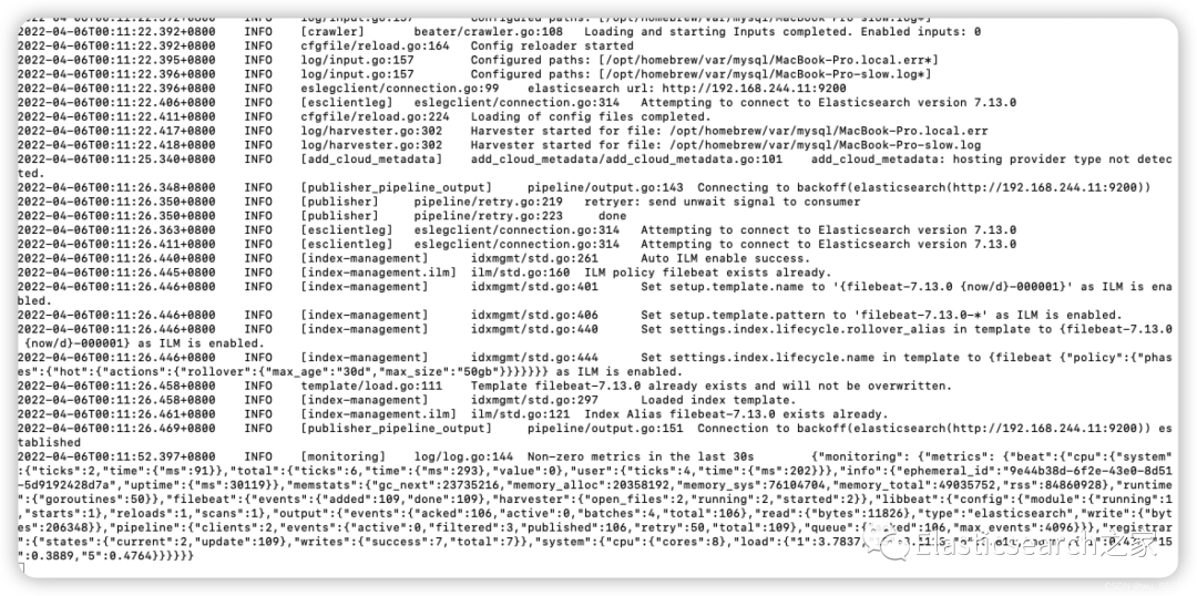 - module: mysql# Error logserror:enabled: true# 日志路径,如果不配置,filebeat将按照操作系统选择日志路径.var.paths: ["/opt/homebrew/var/mysql/MacBook-Pro.local.err*"]# Slow logsslowlog:enabled: true# 日志路径,如果不配置,filebeat将按照操作系统选择日志路径.var.paths: ["/opt/homebrew/var/mysql/MacBook-Pro-slow.log*"]
