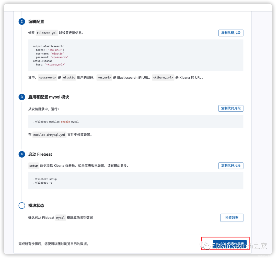 以下安装步骤也可以在kibana主页>添加数据>MySQL日志页面中看到
