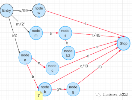 。试想,假如列中包含 10亿 数量级的数据,而英文字幕无非就 26 个,也就是说,字幕 a 我们可能重复存储了上亿次。即便是中文,ES在底层存储的时候,也会通过ASCII来转移为字幕,最终以 bits 存储,这种问题,数量级越大,越严重。实际上这些有公共前缀或公共后缀的地方,我们完全可以只存储一次以追求更高的效率。ES 在数据存储上采用的 FST 这种模型,在保证了高性能的前体系,带来了指数级的存储效率提升,一个TB级的索引,通过FST存储,其构建的模型大小在1GB左右。比如下 图二 就是 图一中词项字典的 FST模型。图三为其二进制序列的十进制展示。这里我们只借鉴思想,而不探究原理,FST 的模型建立过程非常复杂,我在关于倒排索引