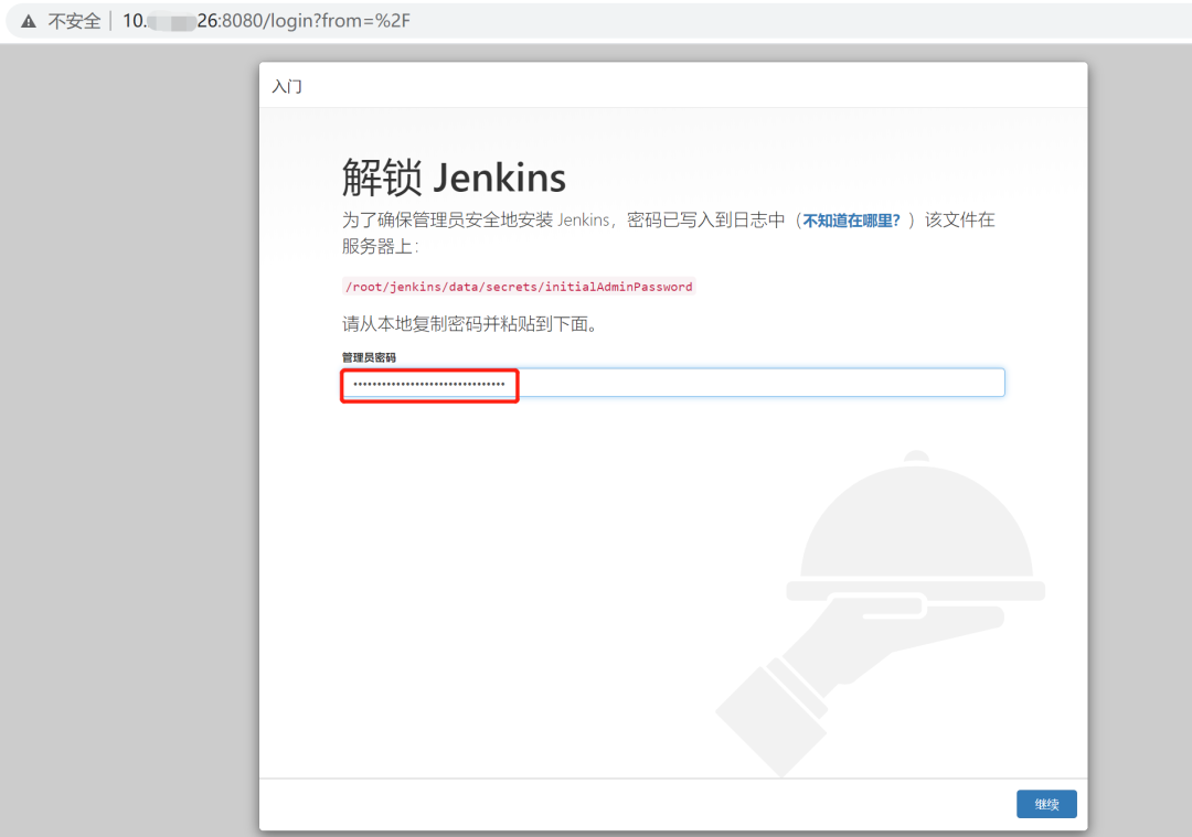 3、登录WEB界面,输入刚刚复制的管理员密码,然后执行默认的"下一步"按钮即可,如下图所示: