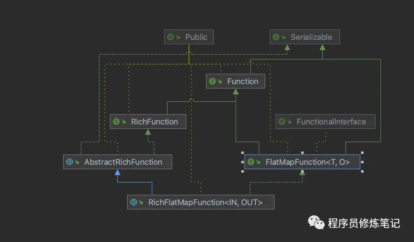 从类图上我们可以看到我们FlatMapFunction继承自Function,同时他有一个子类抽象类RichFlatMapFunction,RichFlatMapFunction又继承自AbstractRichFunction,AbstractRichFunction 又实现了RickFunction,RickFunction最终又继承了Function。