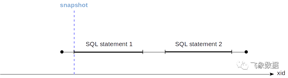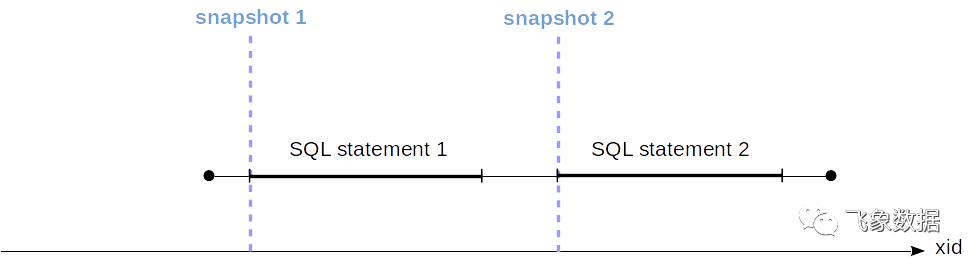 在“读取已提交”隔离级别中,将在每个事务语句的开头创建一个快照。在执行语句时,此快照处于活动状态。在图中,快照创建的时刻(它由事务ID决定)以蓝色显示。