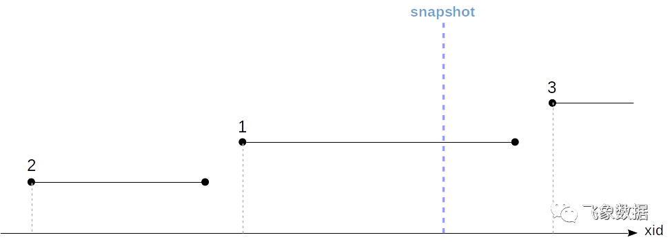 在此图中,最低的快照与未完成的事务有关,在其他快照中,快照snapshot.xmin不能大于事务ID。