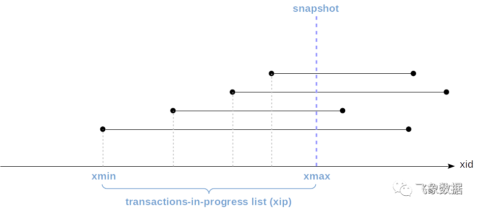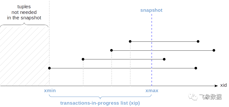 现在,如果我们使一个段代表快照(从snapshot.xmin到snapshot.xmax)而不是事务,那么我们可以将情况可视化如下: