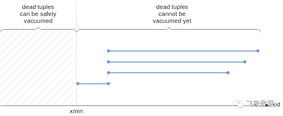 我们还可以在数据库级别定义范围。为此,我们需要获取所有活动快照并xmin在其中找到最旧的快照。它将定义范围,超过该范围,数据库中的无效元组将对任何事务都不可见。这样的元组可以被清除掉 -这就是为什么从实际的角度来看,视界范围的概念如此重要的原因。