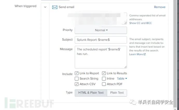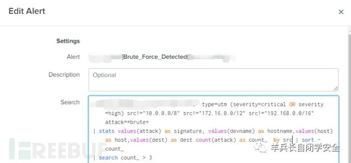 这里SPL语句的意思是,筛选这台防火墙utm模块的安全日志,等级为高的,源地址为外部地址的,攻击签名带有暴力破解的事件,因为可能1个外部IP会有很多条日志,为了好看,使用stats统计命令,将其他字段的值根据源IP来合并,然后当搜索暴力破解事件出现次数大于3时(HVV时调的低一点),就出告警,此搜索语句,每30分钟执行一次,搜索前30分钟内的事件,然后告警触发时,发送邮件给运维小哥和我张三