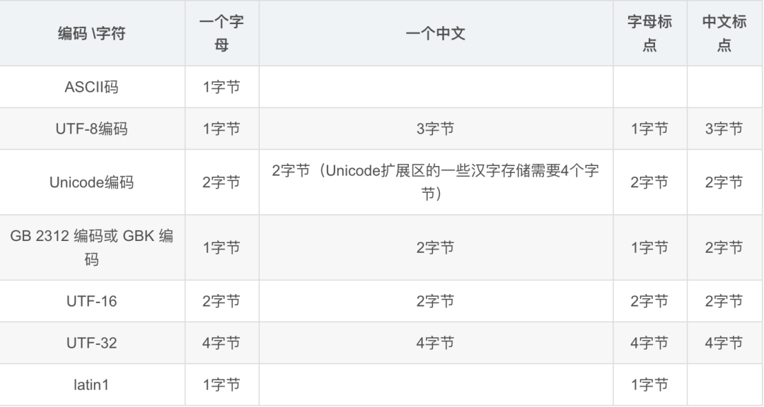 我们看到中文的5个字length函数统计后长度为15,代表占用了15个字节,而使用charcter_length函数统计长度是5,代表有5个字符。所以varchar代表的是字符长度,因为有些复杂的字符或者中文,一个字节表示不了,utf8编码格式的一个中文汉字占用3个字节。不同的数据库编码格式,占用不同的字节数对照表如下: