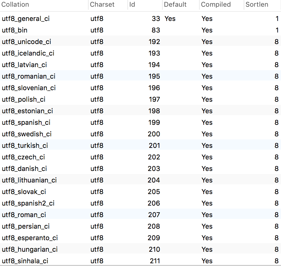 那么如果我们只想查询出小写a的值该怎么办?先看看mysql支持哪些Collation?