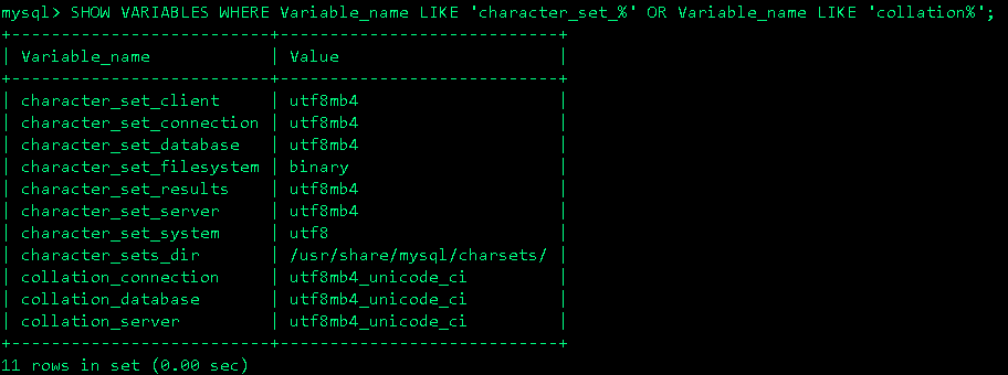 SHOW VARIABLES WHERE Variable_name LIKE 'character_set_%' OR Variable_name LIKE 'collation%';ji