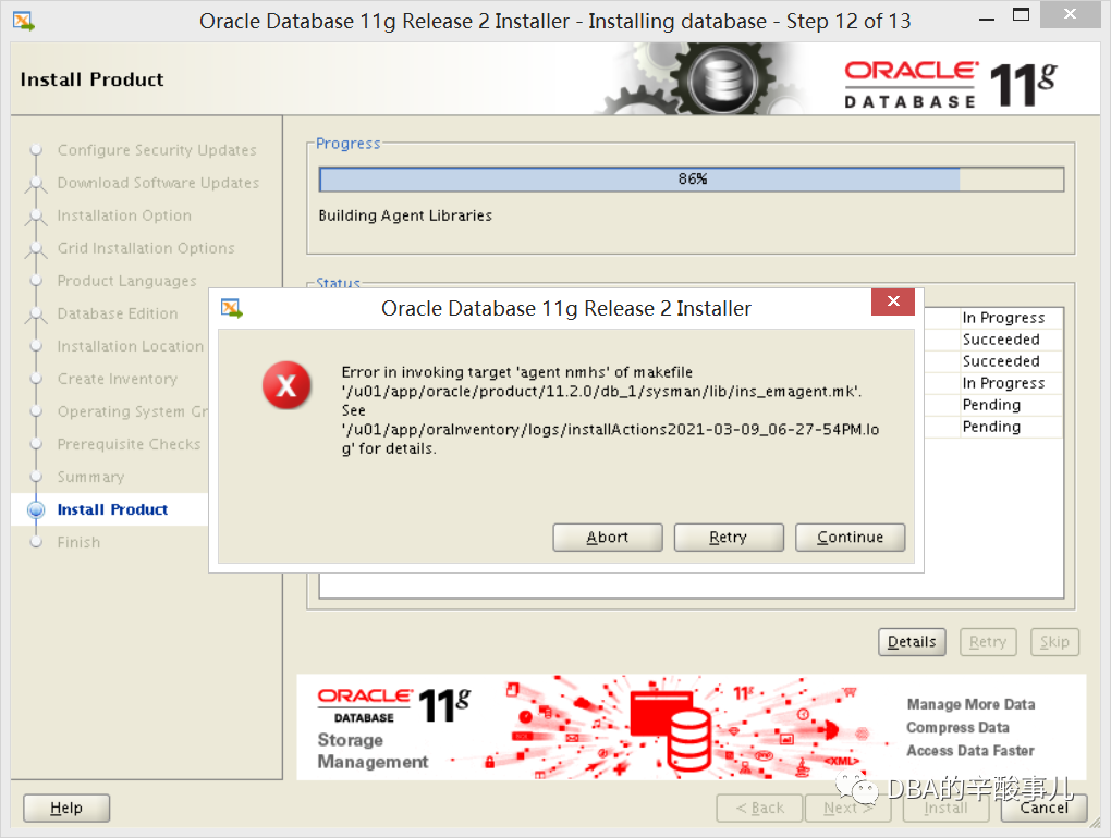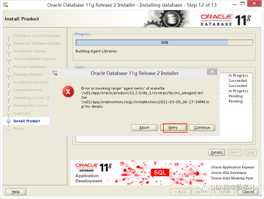 官方的解释说是先继续安装,然后再打补丁,这个bug19692824是在创建数据库的时候引发的。如果你在安装数据库软件的时候就报错。
