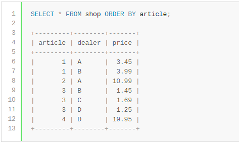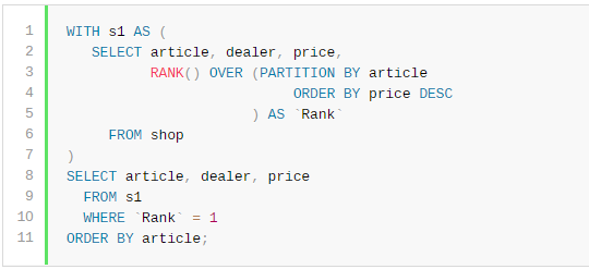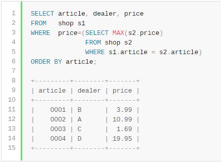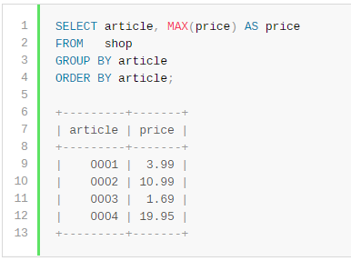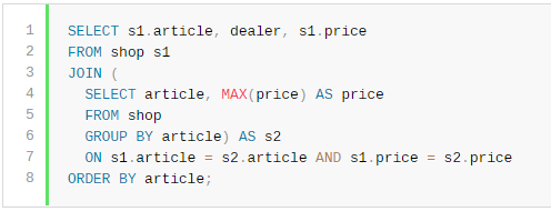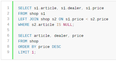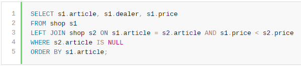 LEFT JOIN 的工作原理是,当s1.price处于其最大值时,没有值更大的s2.price,因此相应的s2.article值为 NULL。
