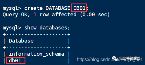 mysql> show databases;+--------------------+| Database |+--------------------+| information_schema || db01 || mysql || performance_schema || sys |+--------------------+5 rows in set (0.00 sec)