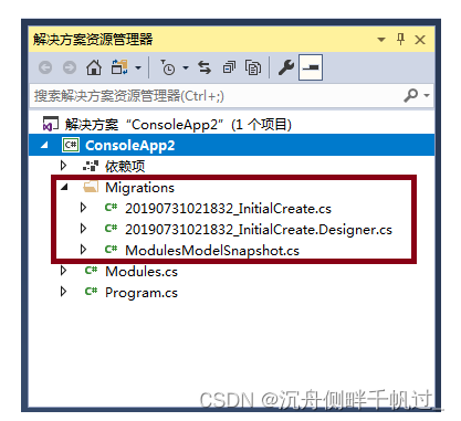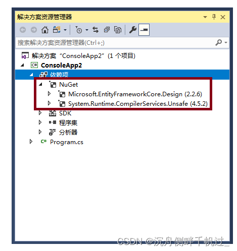 打开项目ConsoleApp_Efcod,会看到“依赖项”->“Nuget”下有如下引用: