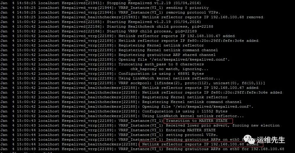 1.杀掉haproxy进程,会看到haproxy会通过keepalived指定的监测脚本启动起来。Haproxy进程恢复正常,keepalived并未切换到备机。