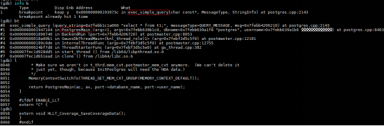 以调试select语句为例,gdb attach 进程号,在exec_simple_query打上断点,执行select语句即可开始调试