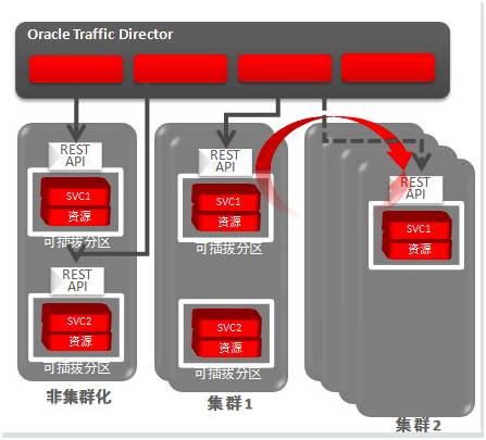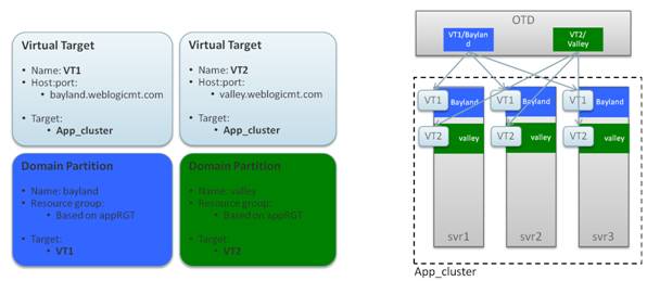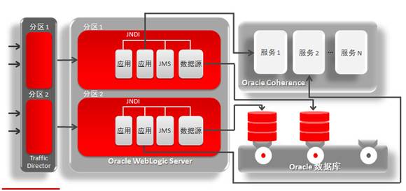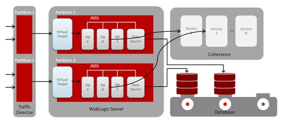 在域层面上实施整合/虚拟化,实现域分区端到端的集成。从Web层流量路由到定义的虚拟目标,一旦请求进入一个分区,它呆在该分区。每个分区都有自己JNDI树,可以任何使用分区内的资源。