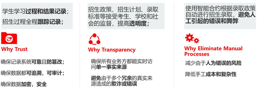 在高中阶段学校考试招生的改革落实中,面临诸多挑战,如何保证初中学业水平考试、综合素质表现评价和招生录取等环节公平公开公正,怎么实现监督检查、申诉受理、诚信档案和责任追究等机制,如何杜绝徇私舞弊、弄虚作假等违规违纪行为,需要先进的技术和规范的制度相结合。利用技术手段实现数据不可篡改、行为可追溯和可审计,使用制度依法打击数据源头造假和徇私舞弊。