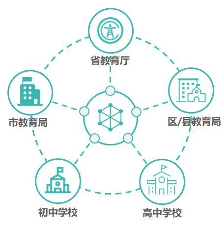 构建区块链网络时,相关的参与方包括:省教育厅、市教育局、各区(县)教育局、各初中学校和高中学校。初中学校采集学生的综合素质和学习过程信息;教育局组织招生考试和录取工作,同时负责对各环节进行监督和追责;高中学校进行自主招生;省教育厅负责监督。区块链的拓扑图如下: