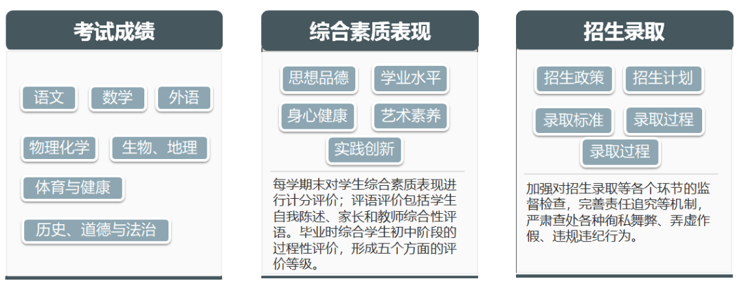 综合评价包括思想品德、学业水平、身心健康、艺术素养和实践创新五个方面的“重要观测点”,每学期对学生综合素质表现进行计分评价;毕业时综合学生初中阶段的过程性评价,形成五个方面的评价等级,为高中阶段学校招生录取工作服务。