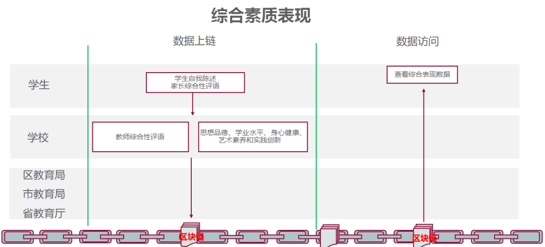 从业务上讲,需要存入区块链账本的数据信息包括学业考试成绩、综合素质表现和招生录取各环节信息: