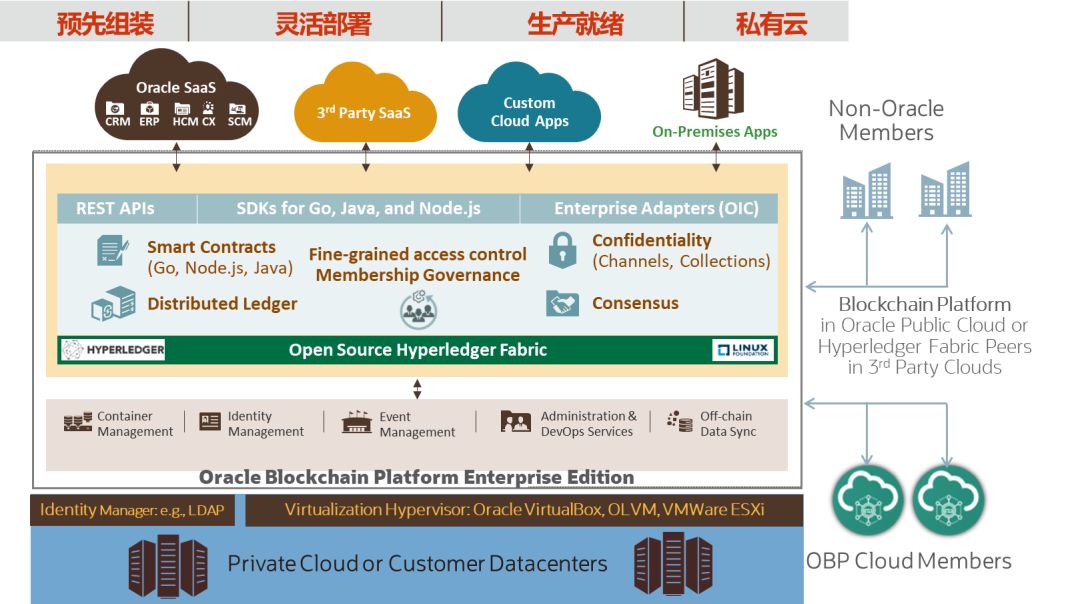 Oracle区块链平台以云服务和本地OP两种方式提供,让企业从复杂的底层技术中解脱,专注于具体的业务创新。提供丰富的控制台管理工具,监视仪表板,支持动态管理监控networks、nodes、channel和chaincode等;提供各种Rest API接口,包括管理监控、智能合约调用和事件等;支持chaincode中基于SQL的富数据查询;支持账本数据分析/BI集成。