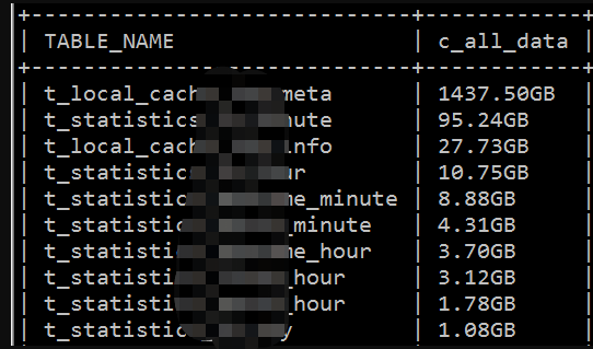 select TABLE_NAME, concat(round(DATA_LENGTH/1024/1024/1024, 2),'GB') as c_all_data
