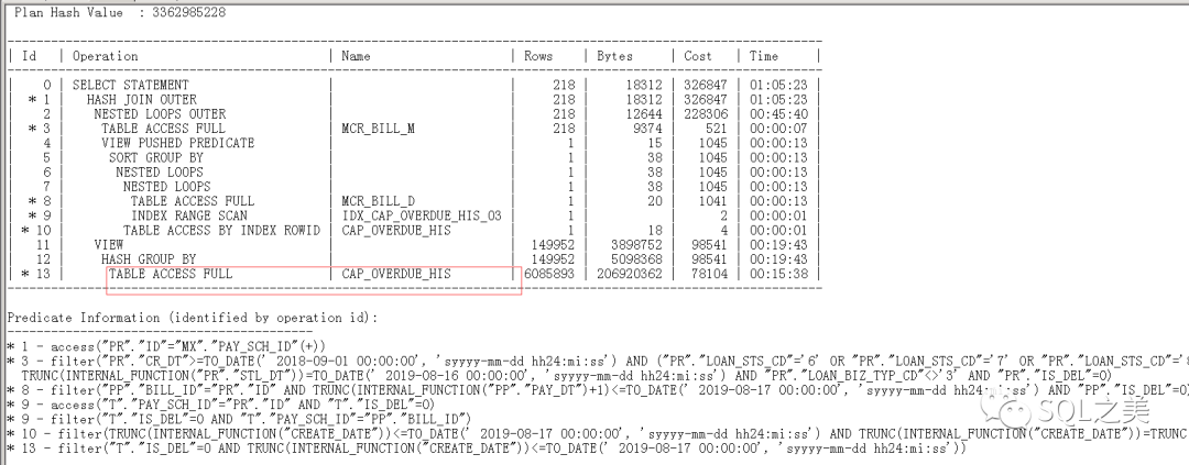很明显,谓词虽然推入成功了,但是这个千万级大表CAP_OVERDUE_HIS的全表扫描没有避免,整体效率没有得到提升。无法谓词推入,源表也没有好的过滤方式,到这里,我们就不能纠结TER内部逻辑了,总览整个SQL发现