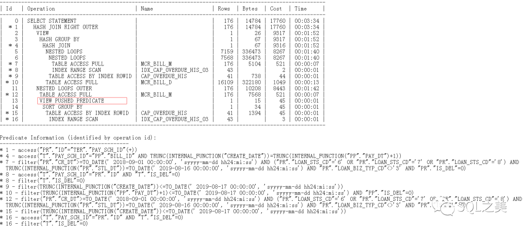 我们知道,当SQL语句包含不能合并的视图同时视图有谓词过滤也就是where过滤条件的时候,CBO会将谓词过滤条件推入视图,这就是谓词推入。这里MX表就是成功走了连接列谓词推入,但是TER表却失败了。