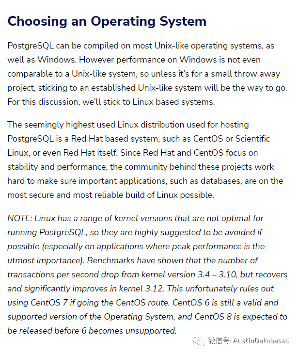 PostgreSQL 是支持多种操作系统的,但这不是说POSTGRESQL 在每种操作系统上,使用同样的硬件配置的情况下,性能的表现是一致,基于主流的POSTGRESQL 的使用和安装等方式,LINUX 上的POSTGRESQL 上的性能要优于其他版本上的POSTGRESQL 的性能,同时更高版本的LINUX 系统为POSTGRESQL 提供更多的基于系统级别的新的性能提高的可能性,如更好的压缩方式,更好的内存访问的方式,更稳定的CPU调用方式,支持更新的CPU架构等等,所以不要认为CENTOS 6 和 CENTOS 8 上的 POSTGRESQL 14 版本的性能是一致的,一定是有差异的。