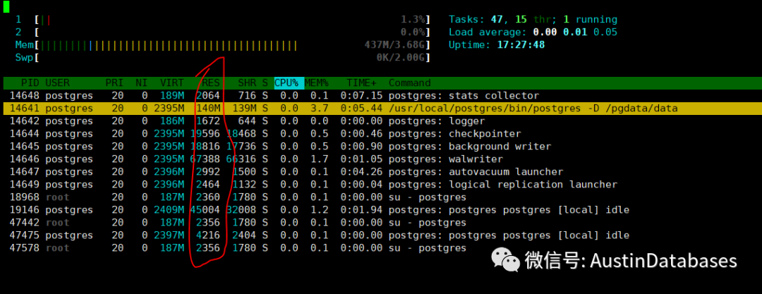 POSTGRESQL 对于max_connections 的设置虽然没有限制,但是针对POSTGRESQL 在高并发中更多的连接数与性能下降在众多的关于POSTGRESQL 的技术文字中都有记录,众所周知,这与POSTGRESQL 本身的架构设计有关,所以更有效的利用 idel 连接,而不是盲目的去开新的连接是一个优化POSTGRESQL 的好的方法,同时基于POSTGRESQL 进程的使用方式,以及MVCC 的原理,定期的. 通过 htop 或者pg_top 等都可以对POSTGRESQL 正在工作的进程的内存进行显示,当发现 idel 连接的实际驻留的物理内存过多,就需要对这些连接进行清理了。