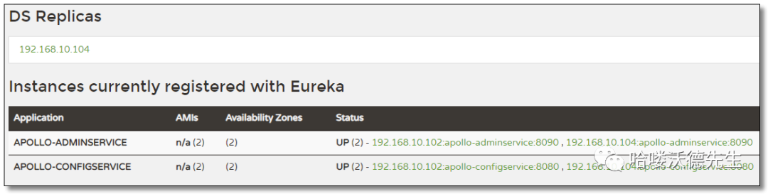 meta: http://192.168.10.102:8080,http://192.168.10.104:8080 # Apollo 中的 Eureka 注册中心地址