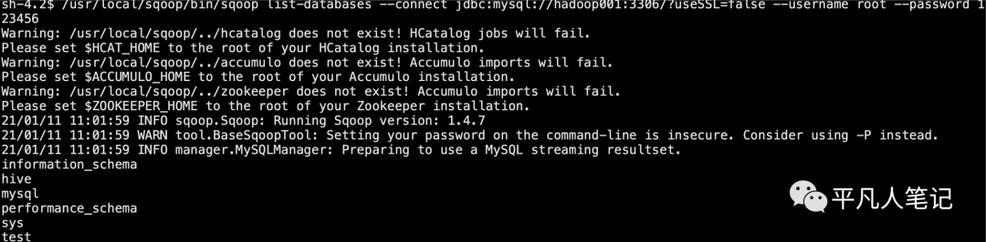 /usr/local/sqoop/bin/sqoop list-databases --connect jdbc:mysql://hadoop001:3306/?useSSL=false --username root --password 123456