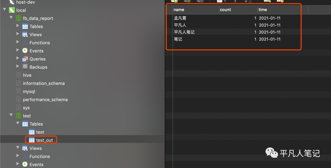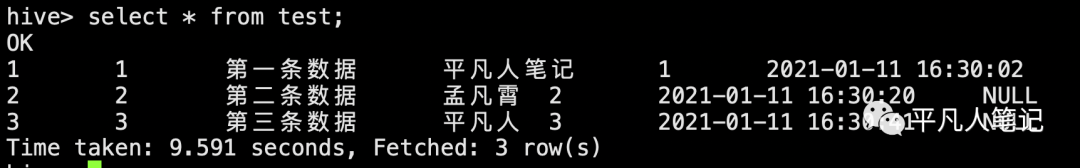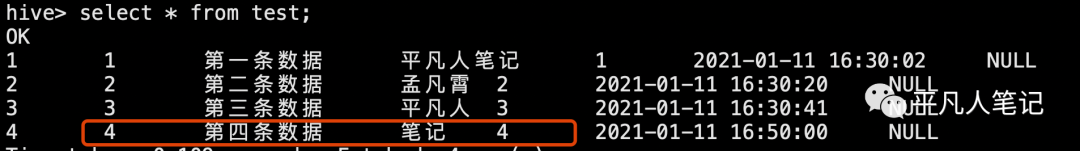 INSERT INTO `test`.`test`(`id`, `uid`, `title`, `name`, `status`, `time`) VALUES (1, 1, '第一条数据', '平凡人笔记', 1, '2021-01-11 16:30:02');