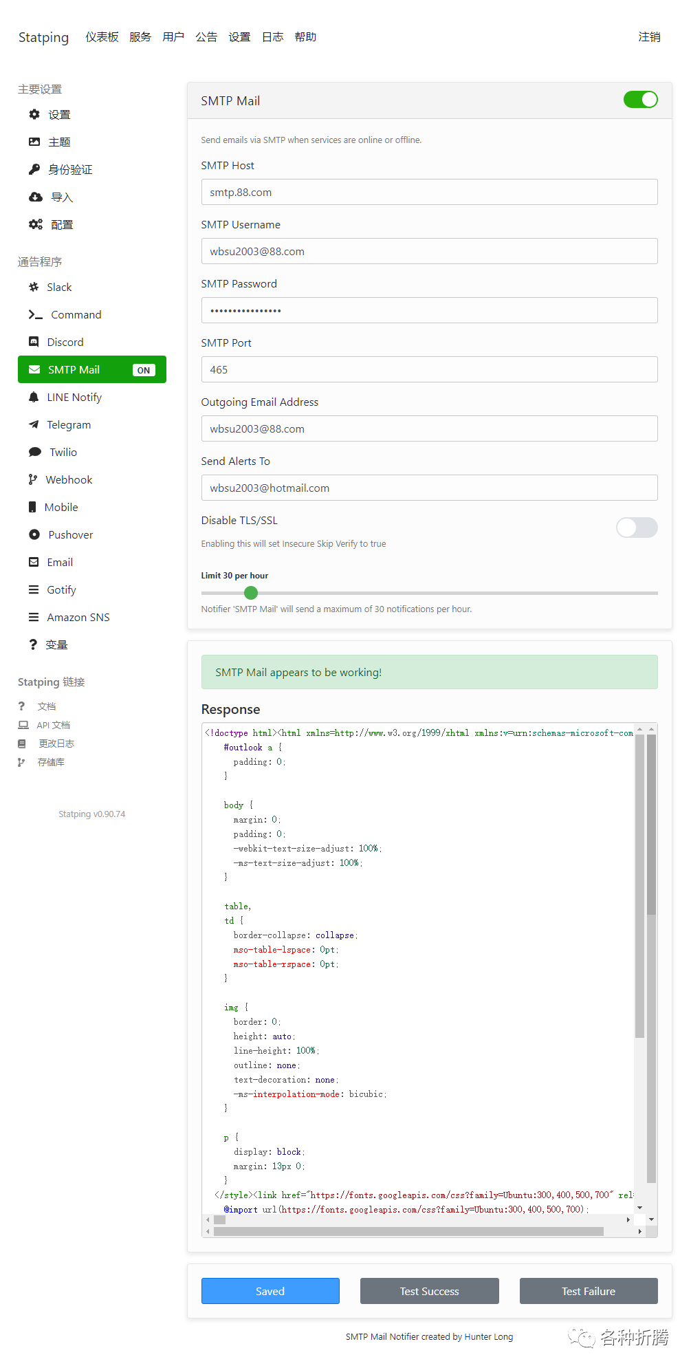 按钮来检查设置是否正确,如果返回 SMTP Mail appears to be working!
