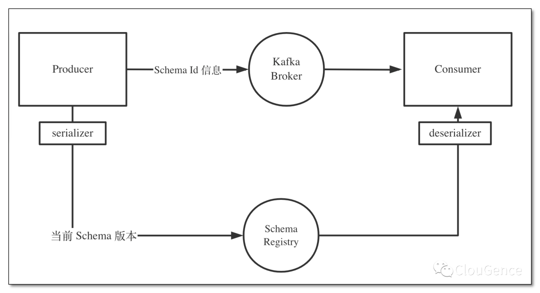 每一个数据引用 Schema ID ,序列化或反序列化时从注册表里拉取对应的 Schema 进行相应动作。