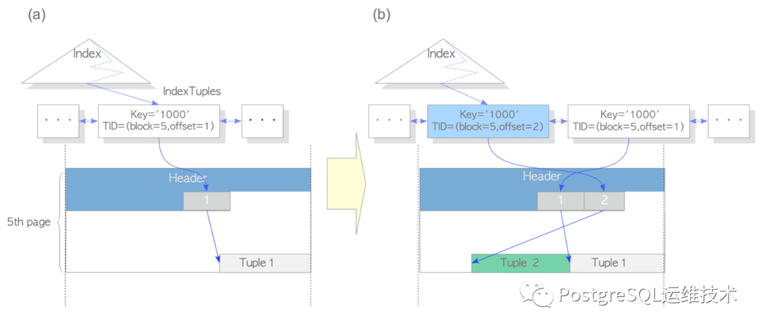 在这种情况下,PostgreSQL不仅会在索引页中插入新的表元组,还会插入新的索引元组。见图7.1(b)。