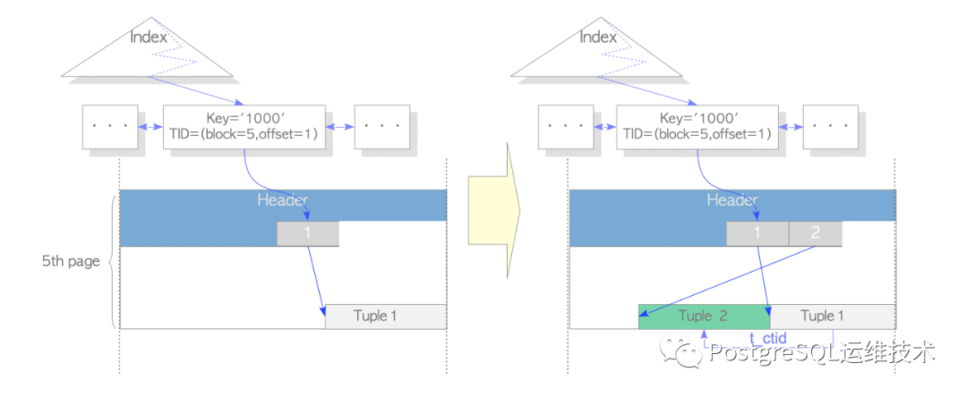 当某一行数据使用HOT的方式被更新时,如果被更新的行与旧行数据存储在同一个页面,那么PG不会插入相应的索引元组。并且将老数据行的t_informask2字段设置为HEAP_HOT_UPDATE位, 新数据行的t_informask2字段设置为HEAP_ONLY_TUPLE位。参见图7.2和图7.3。