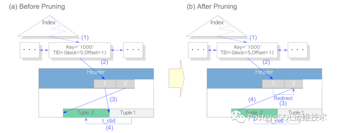 为了解决这个问题,PostgreSQL在适当的时候将指向旧元组的行指针重定向到指向新元组的行指针。在PostgreSQL中,这种处理称为剪枝。图7.4(b)描述了PostgreSQL如何访问修剪后更新的元组。