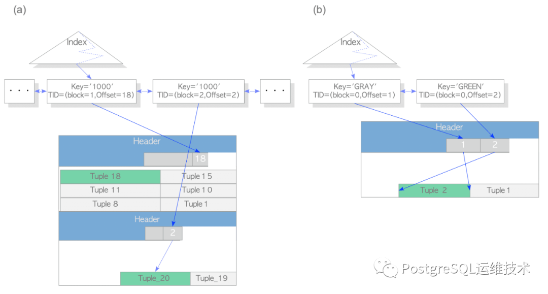 表tbl有1000个元组, id为'1000'的最后一个元组存储在表的第5页,最后一个元组指向对应的索引元组,其键为'1000',tid为'(5,1)'。参见图7.1(a)。