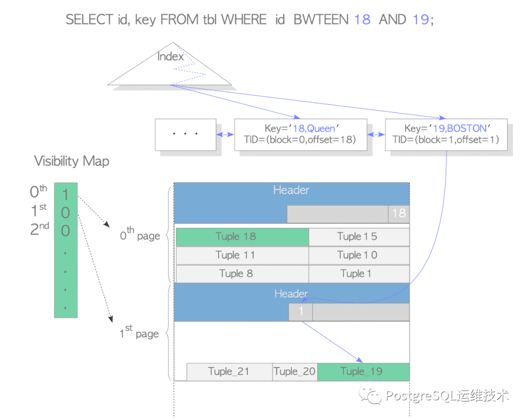 为了避免这种困境,PostgreSQL使用目标表的可见性映射。如果存储在一个页面中的所有元组都是可见的,PostgreSQL使用索引元组的键,而不访问索引元组指向的表页来检查其可见性;否则,PostgreSQL从index元组中读取指向的表元组,并检查元组的可见性。
