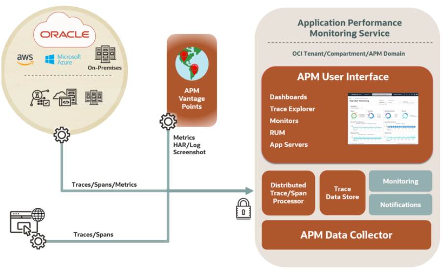 OCI应用程序性能监控提供了四种不同的特性,使应用程序管理员和DevOps专业人员通过启用跨客户机、第三方服务和部署在云中或本地部署的后端计算层的多个组件和应用程序逻辑的监控等,真实地了解每个用户的体验。