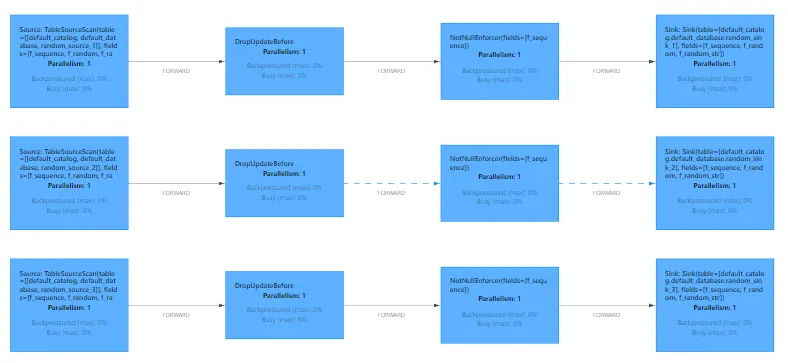 开源版的 MySQL CDC Connector 在 SQL 模式下,每同步一张表,都需要建立一条完整的链路,这也代表着一个对上游数据库的 Binlog Reader,作业的运行图类似下图: