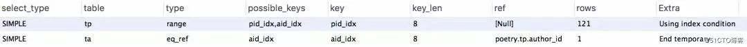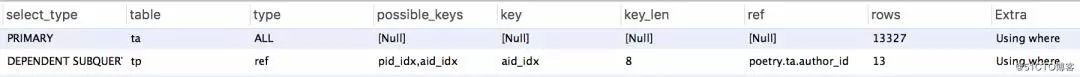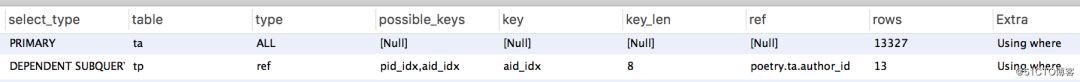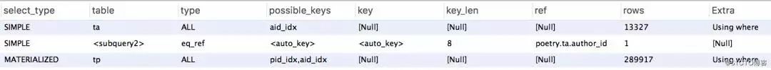 对t_poetry表的子查询结果集很小,且两者在t_poetry表都能使用索引,对t_poetry子查询的消耗基本一致。两者区别在于,使用 in 时,t_author表能使用索引: