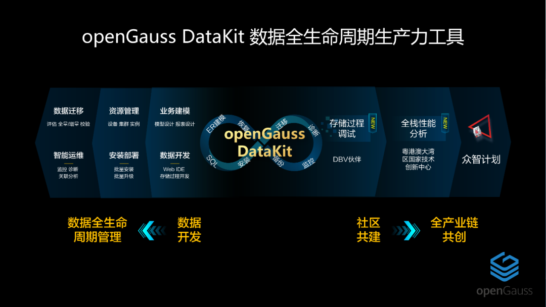 针对行业应用过程中的业务建模、开发、管理、安装部署和迁移运维openGauss社区联合伙伴开发了大量工具,帮助用户从使用数据库到实现数据全生命周期的管理。会上,openGauss社区全新升级社区工具DataKit,其集成目前openGauss所有相关工具,形成工具超市,开发和运维人员可快速按需找到所需工具,方便快捷。