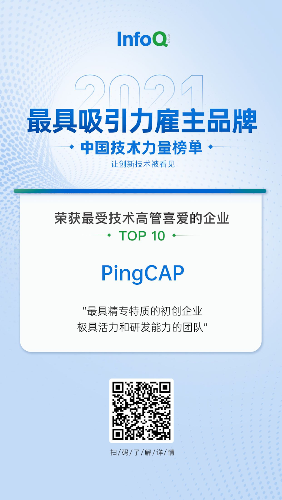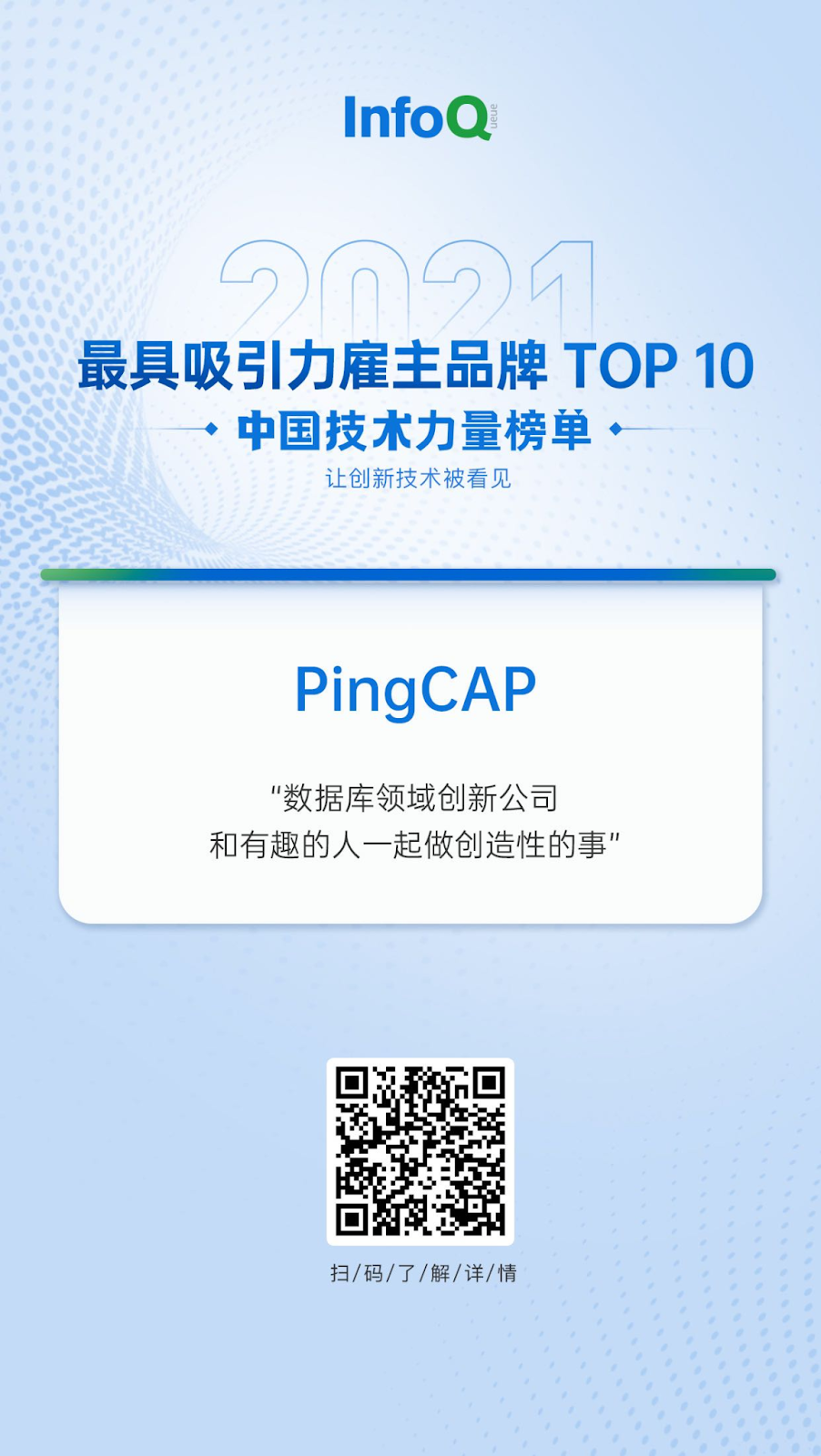 日前,InfoQ 公布了 2021 中国技术力量之“最具吸引力雇主品牌”系列榜单评选结果。经过专家团评审及开发者投票, PingCAP 上榜 2021 最具吸引力雇主品牌 TOP 10、2021 最受技术高管喜爱的企业 TOP 10 两项榜单。