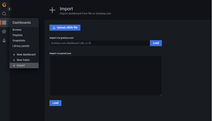 登录Grafana(浏览器输入grafana所在IP:端口号), 设置prometheus数据源,按下图所示方法上传提供好的dashboard面板文件:
