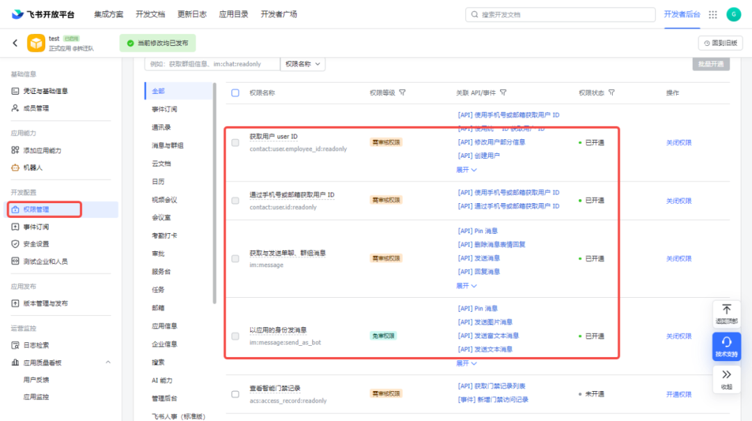 1.1 用户需首先在飞书创建企业应用,开通机器人功能,并为该应用开启如下权限