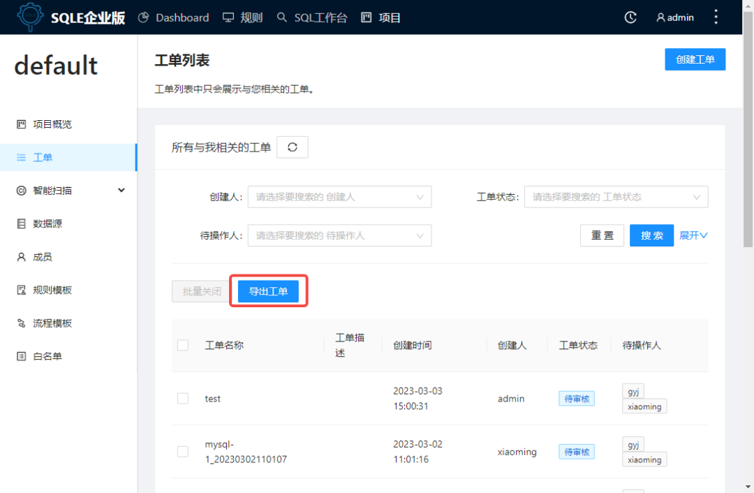 用户进入工单列表,设置相应筛选条件后,点击列表上方的【导出工单】按钮