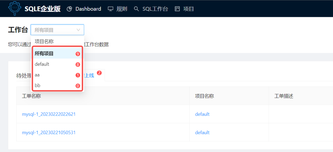 点击项目筛选框,可查看当前用户可用的项目,及项目中需要关注的工单数量